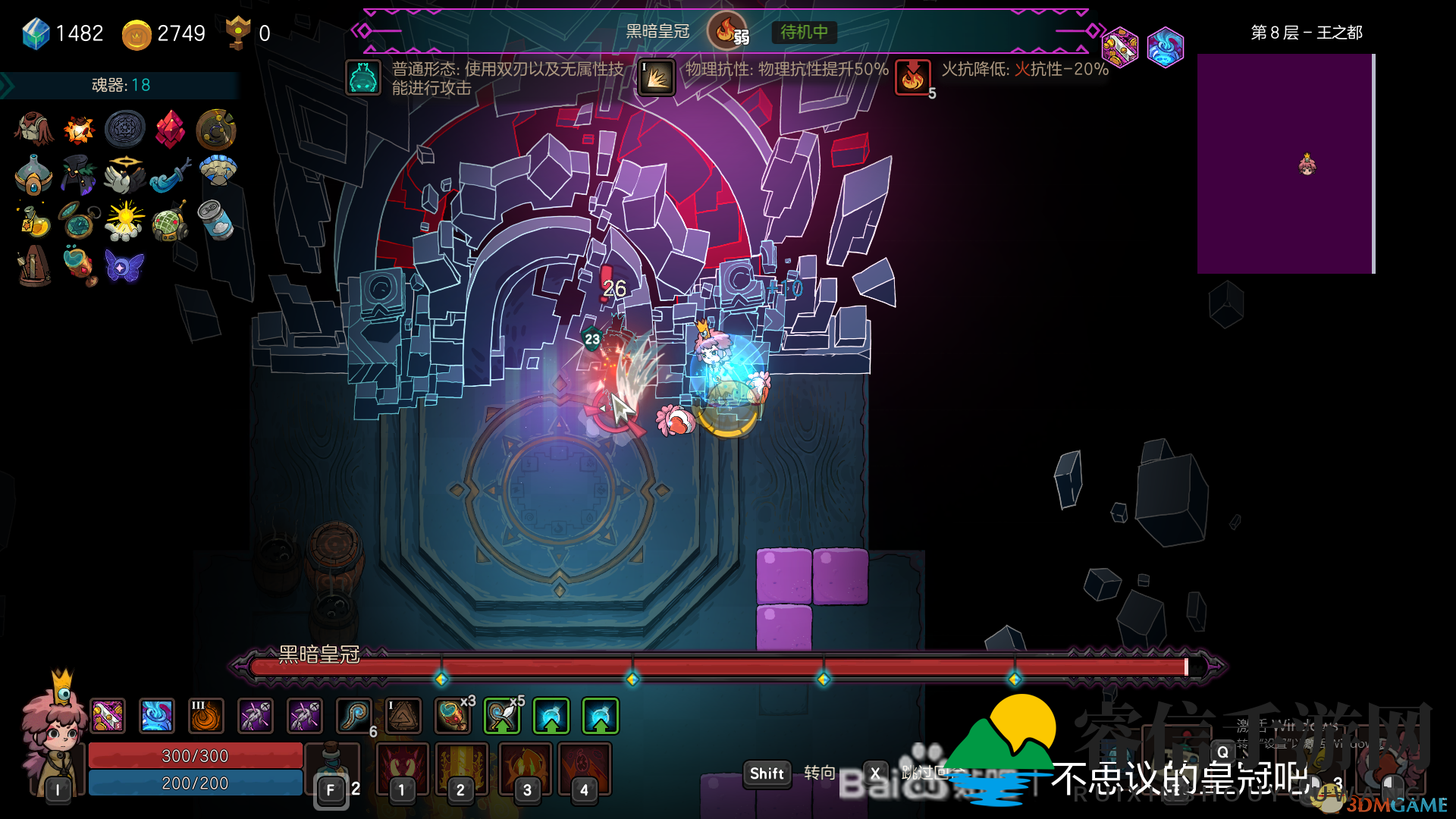 必须提醒一句,这个boss确实难打,它拥有三条命,每一命都异常强大。第二命可以免疫物理攻击,第三命甚至能吸收并转化物理攻击伤害为相应的血量。因此,当战斗进行到这里时,记得多携带一些元素卷轴。